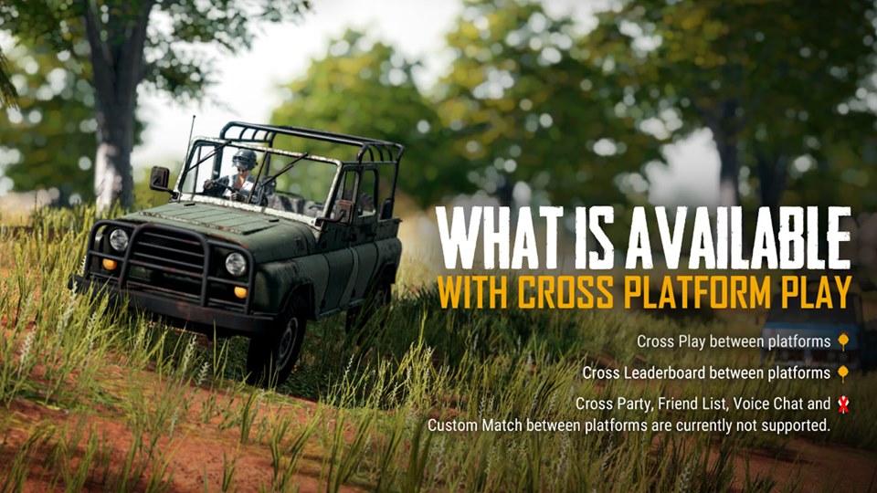 สำหรับการสร้าง Squad แบบข้ามแพลตฟอร์ม, รายชื่อเพื่อน, และการสื่อสารด้วยเสียง และรวมถึงการเข้าร่วมห้องแบบกำหนดเองนั้นจะยังไม่รองรับการใช้งานในตอนนี้