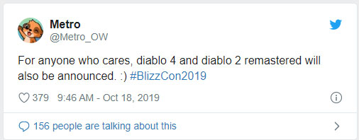 Metro ยังแชร์ภาพเกี่ยวกับสื่อส่งเสริมการขายของ BlizzCon 2019 ซึ่งพูดถึง Diablo 4 อย่างชัดเจน
